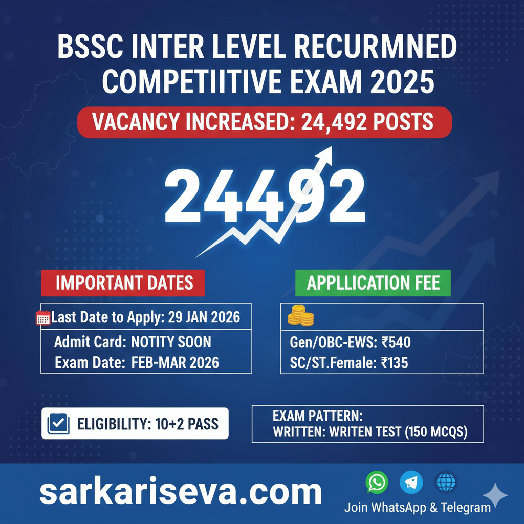 Short Information: Bihar Staff Selection Commission (BSSC) has extended the last date to apply for the Inter Level Exam. Eligible candidates can check the updated schedule and fees on **sarkariseva.com**.