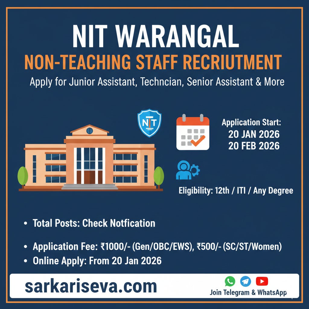 sarkariseva.com рдПрдХ рдирд┐рдЬреА рд╡реЗрдмрд╕рд╛рдЗрдЯ рд╣реИред рд╣рдо рд╕рдЯреАрдХ рдЬрд╛рдирдХрд╛рд░реА рдкреНрд░рджрд╛рди рдХрд░рдиреЗ рдХрд╛ рдкреВрд░рд╛ рдкреНрд░рдпрд╛рд╕ рдХрд░рддреЗ рд╣реИрдВ, рд▓реЗрдХрд┐рди рдХрд┐рд╕реА рднреА рддреНрд░реБрдЯрд┐ рдХреЗ рд▓рд┐рдП рд╣рдо рдЬрд┐рдореНрдореЗрджрд╛рд░ рдирд╣реАрдВ рд╣реЛрдВрдЧреЗред рдХреГрдкрдпрд╛ рдЖрд╡реЗрджрди рдХрд░рдиреЗ рд╕реЗ рдкрд╣рд▓реЗ NIT Warangal рдХреА рдЖрдзрд┐рдХрд╛рд░рд┐рдХ рд╡реЗрдмрд╕рд╛рдЗрдЯ рдкрд░ рдЬрд╛рдХрд░ рдЕрдзрд┐рд╕реВрдЪрдирд╛ рдЕрд╡рд╢реНрдп рдкрдврд╝реЗрдВред