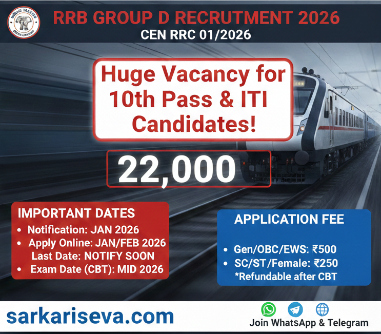 Short Information: Railway Recruitment Board (RRB) has announced the preliminary notice for **22,000+ Group D (Level-1)** posts. Candidates with 10th Pass or ITI can apply. Check all details like Syllabus, PET, and dates on **sarkariseva.com**.